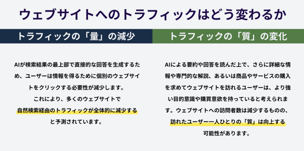 そのため、ウェブサイトへの訪問者数自体は減少する可能性がありますが、一方で実際に訪れるユーザー一人ひとりの「質」は向上するかもしれません。