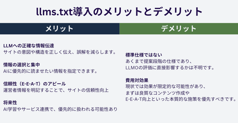 llms.txtはまだ発展途上の技術であり、メリットだけでなく注意点も理解しておく必要があります。