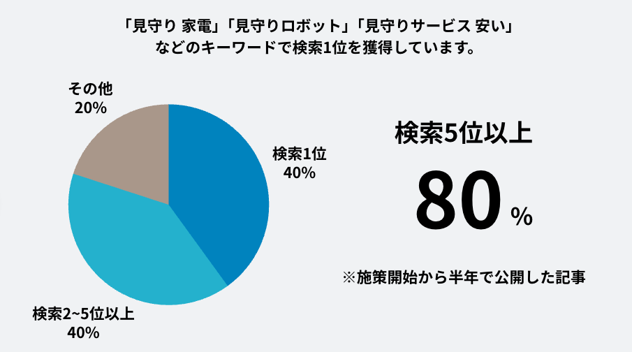 適切なキーワード選定やタグ設定、SEOに最適化したコンテンツ作成により「見守り 家電」「見守りロボット」「見守りサービス 安い」などのキーワードで検索1位を獲得しています。