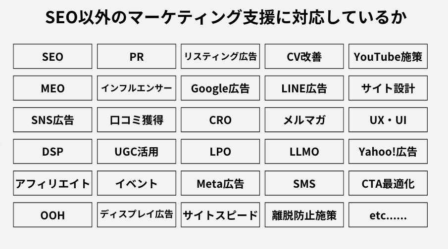 また、SEO会社によっては、CVR改善や広告運用、SNS施策などマーケティング全般に対応していることも多く、幅広い支援を受けられるのも魅力です。社内のリソースやノウハウに限界を感じている場合は、早めにSEOのプロに相談することをおすすめします。