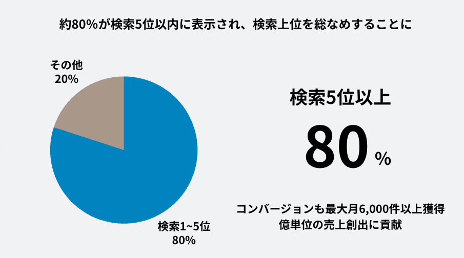 そのほかにも施策開始から半年で公開した記事のうち、約40%が検索1位、約80%が検索5位以上を獲得することに成功しています。